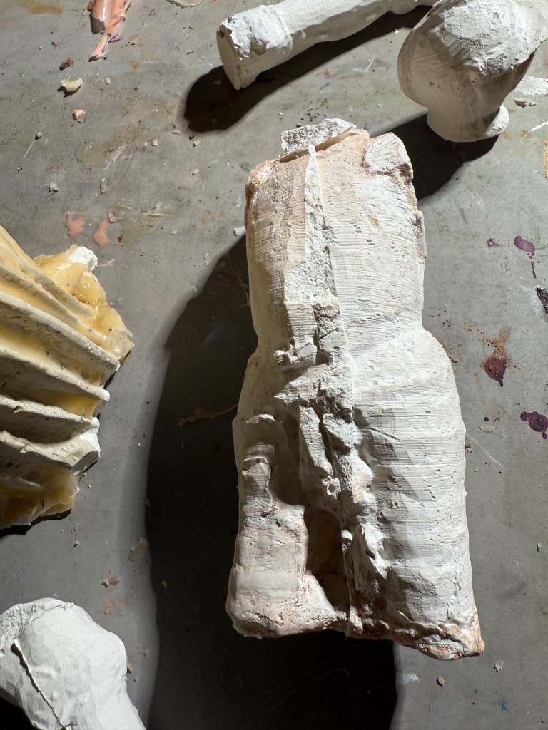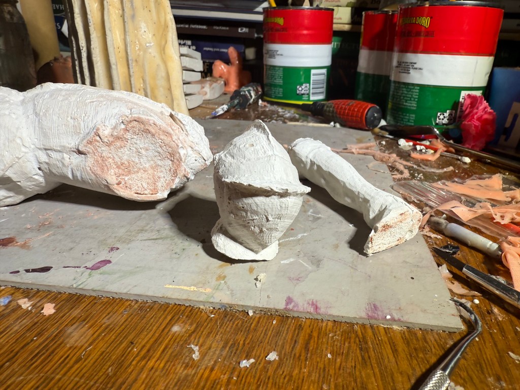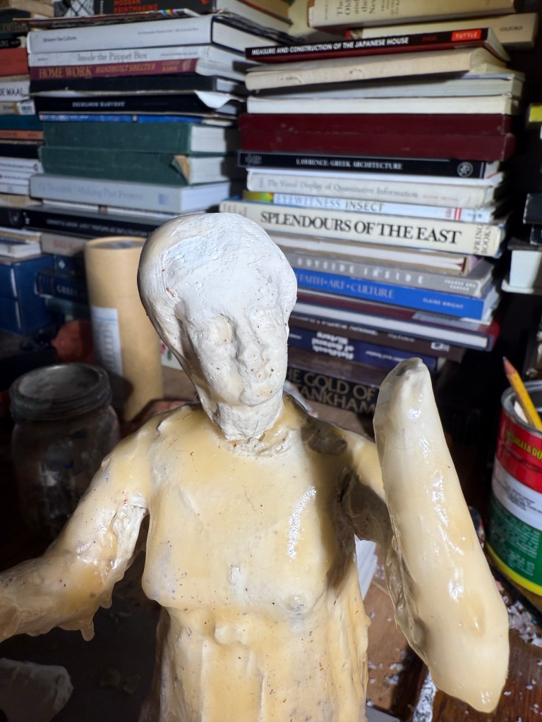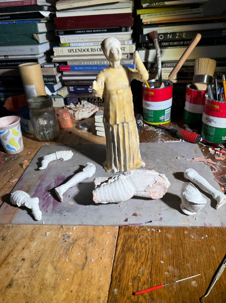 The piece will be displayed at the Worcester Art Museum in a display case in their new arms and armor wing in November. Scans of three museum objects on display (a 16th century German suit of armor, a 3rd c BCE Greek female statue, and a 13th century Khorasanian bronze cat) were taken with a phone through glass. The scans of the objects were then 3D printed and molds were made. The final objects are made with plaster and encaustic and will be displayed on top of a 18 x 24″ linoleum pad with an oak frame, the knight smashed to pieces at the feet of the mourning woman and the cat sitting nearby.