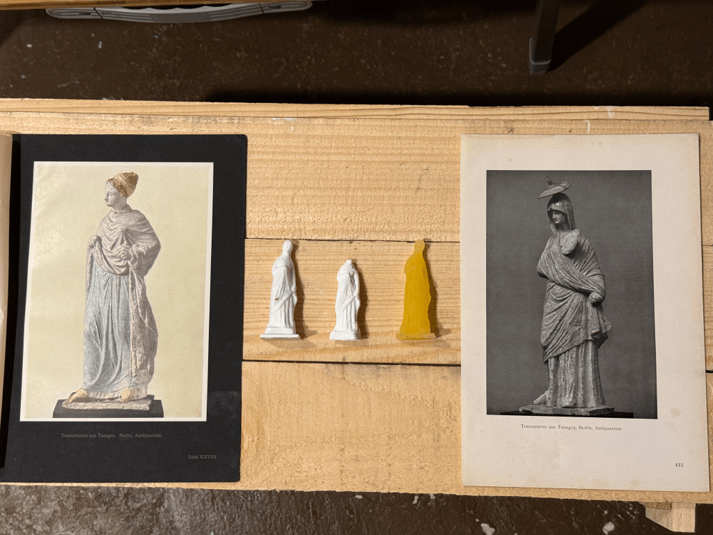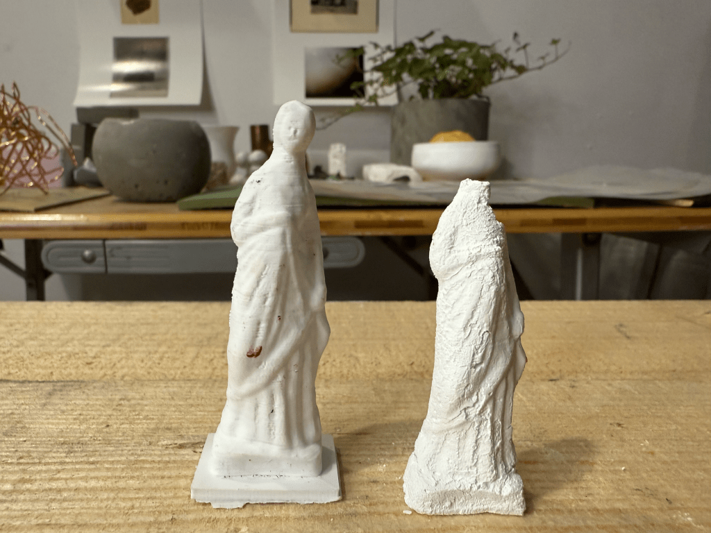 Below are macquettes for projects involving photogrammetry and 3D printing technologies. The technology is used to highlight connections between objects within museums, creating relationships and stories specific to the objects through manipulation of scale, material, and context. The freedom for the contemporary artist to use, as material, the facsimile of a museum object enables explorations of themes of reproduction, authenticity, and ownership.